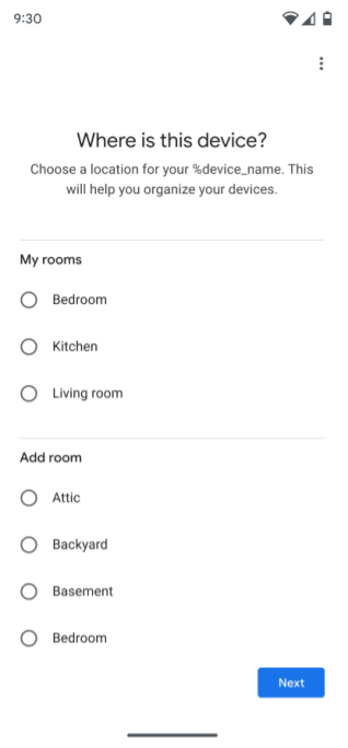 完成委派程序後,建議將使用者帶往應用程式的首頁,或應用程式中顯示使用者剛設定的裝置控制器,或顯示所有裝置完整清單 (包括剛設定的裝置) 的位置。