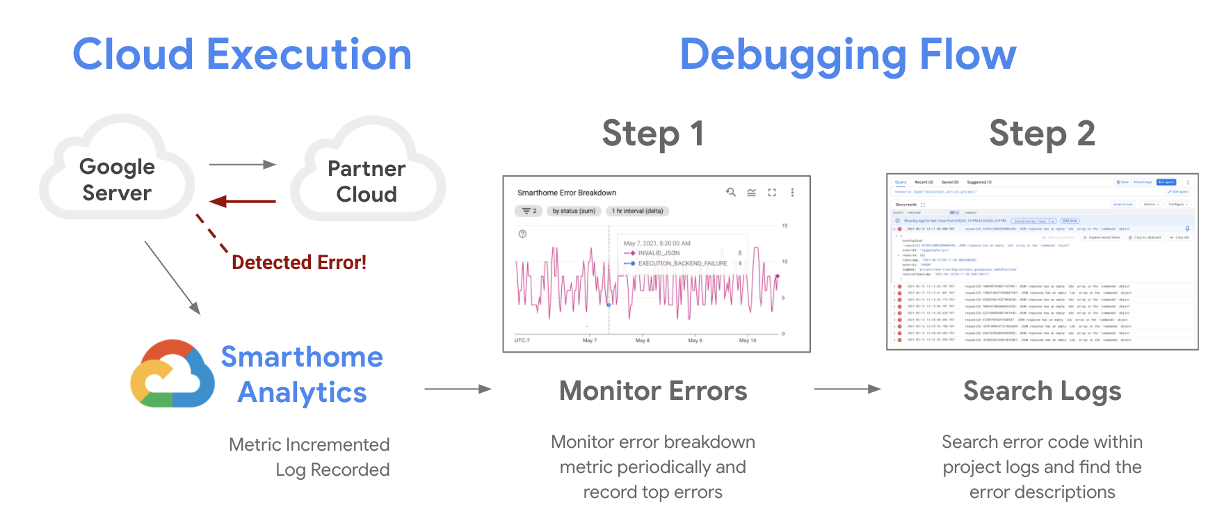 Google Cloud 提供相關工具,讓您透過 Google Cloud Monitoring 監控專案的可靠性,並透過 Google Cloud Logging 錯誤記錄偵錯問題。每當系統無法滿足使用者意圖時,Google Home Analytics 管道會在指標中記錄該失敗事件,並在專案記錄中發布錯誤記錄。