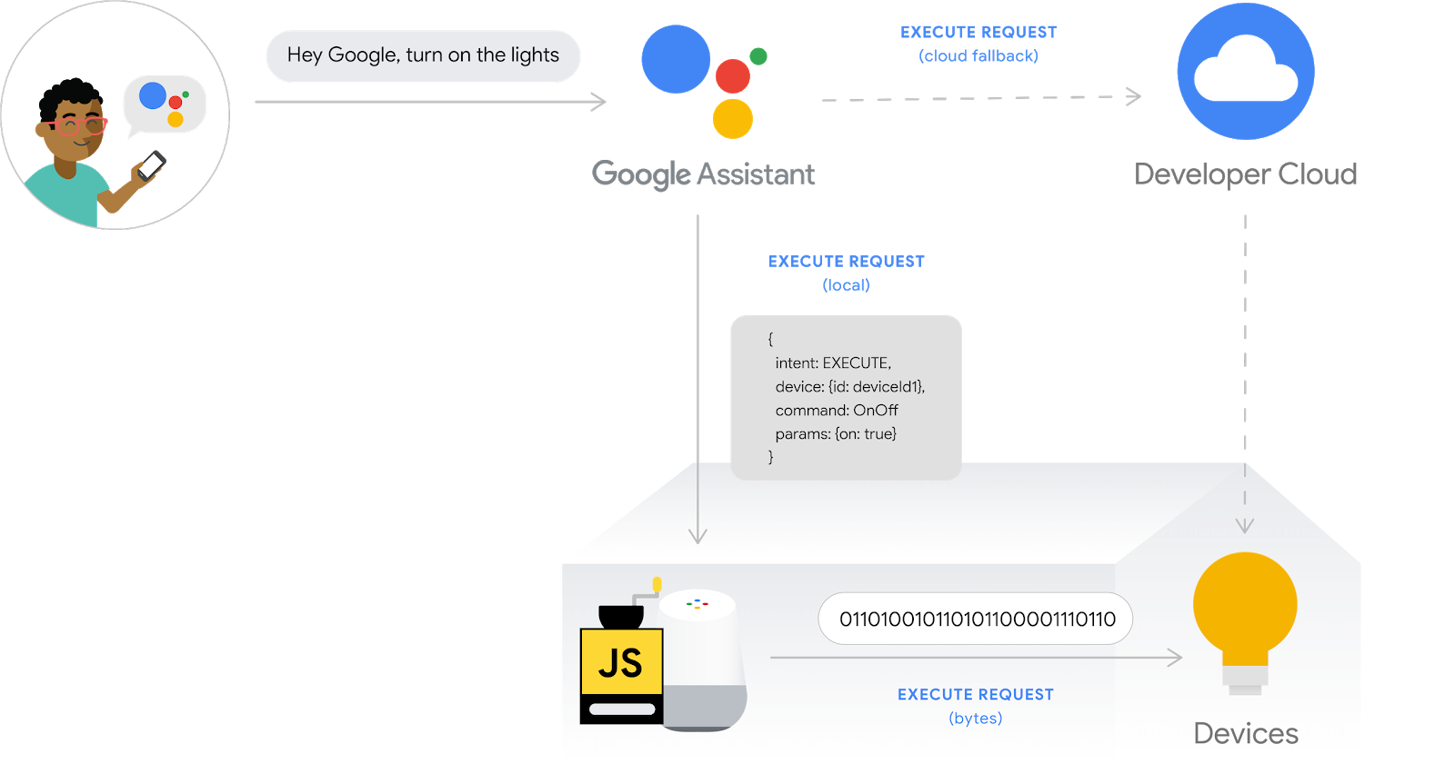 Local Home SDK با افزودن یک مسیر محلی برای مسیریابی اهداف خانه هوشمند به طور مستقیم به یک دستگاه Google Home، ادغام خانه هوشمند شما را بهبود می بخشد، که قابلیت اطمینان را افزایش می دهد و تأخیر در پردازش دستورات کاربران را کاهش می دهد. این به شما امکان میدهد یک برنامه تکمیل محلی را در TypeScript یا JavaScript بنویسید و اجرا کنید که دستگاهها را شناسایی کرده و دستورات را روی هر بلندگوی هوشمند Google Home یا نمایشگر هوشمند Google Nest اجرا میکند. سپس برنامه شما مستقیماً با دستگاههای هوشمند موجود کاربران از طریق شبکه محلی با استفاده از پروتکلهای استاندارد موجود برای اجرای دستورات ارتباط برقرار میکند.