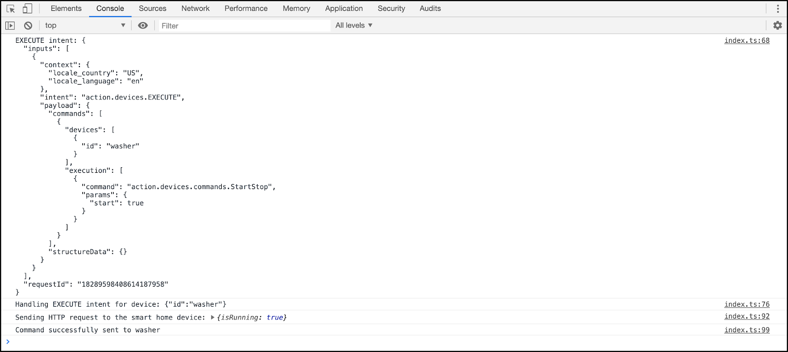 در بخش زیر، بررسی میکنید که دستگاه Google Home میتواند به درستی اسکن، شناسایی و دستورات را به واشر هوشمند مجازی از طریق شبکه محلی ارسال کند. میتوانید از ابزارهای برنامهنویس Google Chrome برای اتصال به دستگاه Google Home، مشاهده گزارشهای کنسول و اشکالزدایی برنامه TypeScript استفاده کنید.
