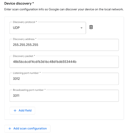باید دستگاه مجازی را طوری پیکربندی کنید که از همان پارامترهای UDP استفاده کند که در پیکربندی اسکن برای کشف دستگاه در Developer Console اعمال کردید. علاوه بر این، باید به دستگاه مجازی بگویید که کدام شناسه دستگاه محلی را گزارش کند و شناسه پروژه ادغام Cloud-to-Cloud برای رویدادهای گزارش وضعیت زمانی که وضعیت دستگاه تغییر می کند استفاده کند.