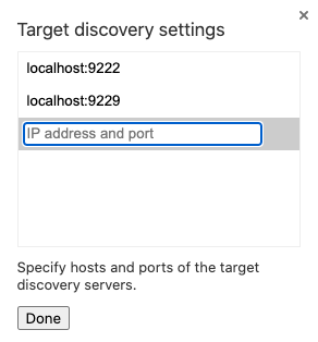 6. Wpisz DEVICE_IP_ADDRESS:9222 na liście i kliknij Gotowe.