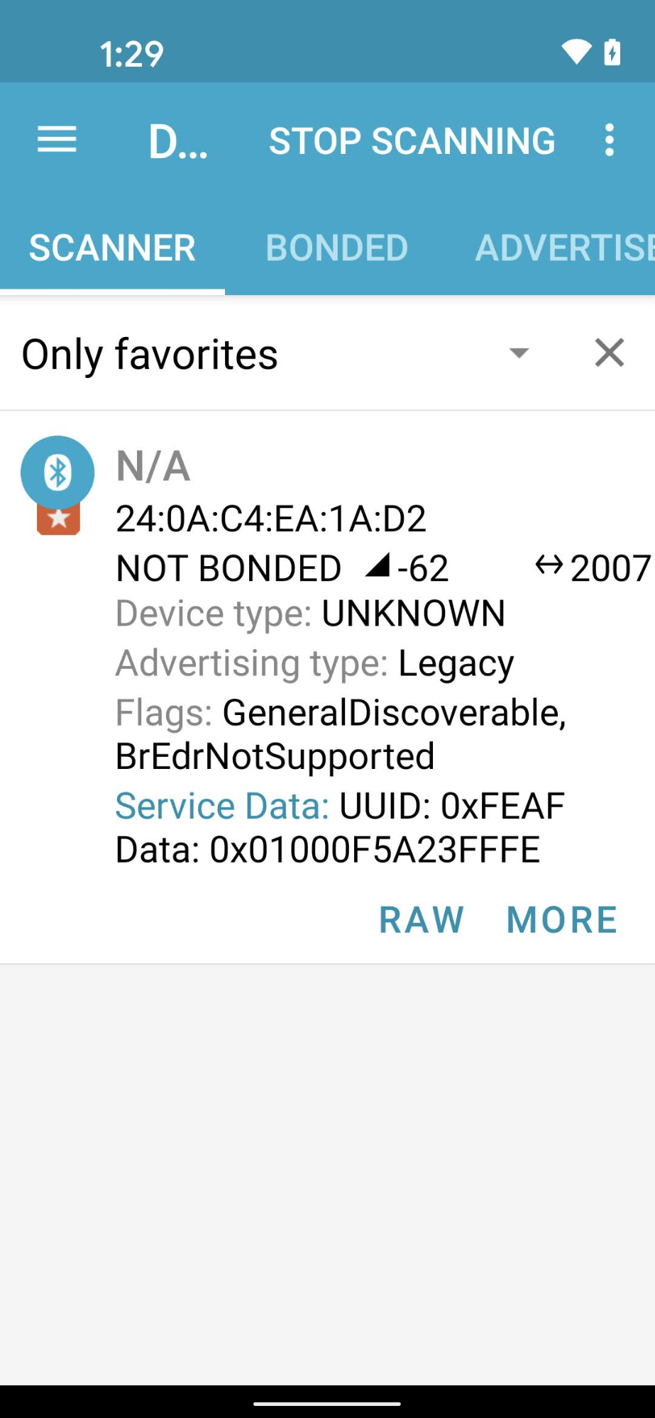در این تصویر از نسخه Android nRF Connect، خواهید دید که VID/PID به صورت 5A23FFFE فهرست شده است که از بایت چهارم فیلد Service Data شروع میشود. این نشان میدهد که VID برابر با 5A23 و PID برابر با FFFE است - هر دو در قالب little endian .