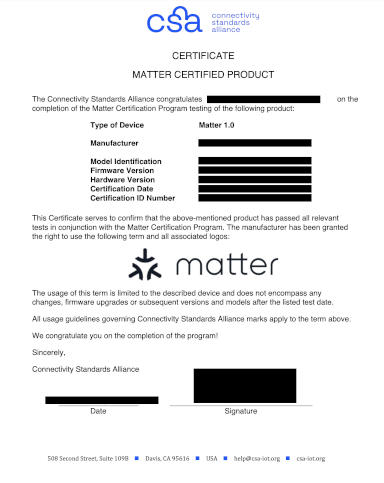 - Documentación que verifique que eres propietario del PID, incluido el certificado de Alliance que indique que tu producto está certificado para Matter. Haz clic aquí para ver un ejemplo.