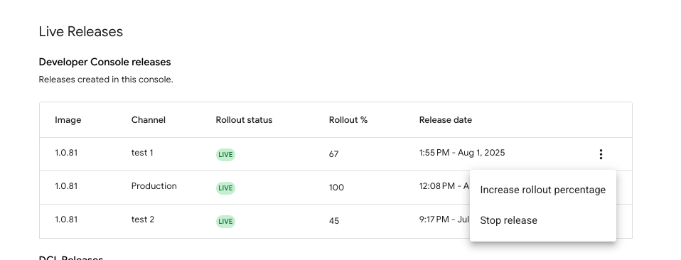 1. Developer Console releases टेबल में, टारगेट चैनल के लिए 'ज़्यादा' मेन्यू पर क्लिक करें. यह चौथी इमेज में दिखाया गया है.