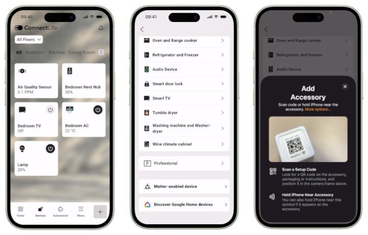 整合 Google Home API 後,使用者就能直接在 ConnectLife 應用程式中,連結數百萬個 Matter 和「與 Google Home 整合」裝置。相較於建構專屬的 Matter 網狀架構,整合作業的完成速度快了 72%,同時也支援強大的跨品牌自動化功能。